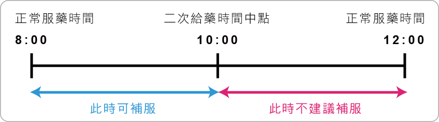 若您想起忘記服藥時請儘快補服;但若已很接近下次的服藥時間時(指超過兩次服藥時間的中點),則請跳過一次劑量,待下次正確之服藥時間到時再行服藥;請勿一次服用兩倍劑量。