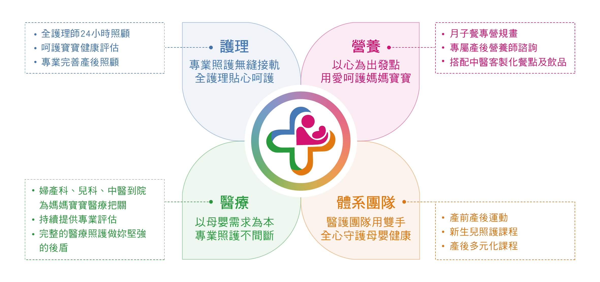 醫療團隊進駐產後護理之家,全程護理師24小時守護母嬰健康,兼具坐月子傳統文化,以最專業的醫療為後盾、專屬中醫調理、健康吃食補調理、守護心靈健康舒壓調理,打造醫療等級的坐月子時光。