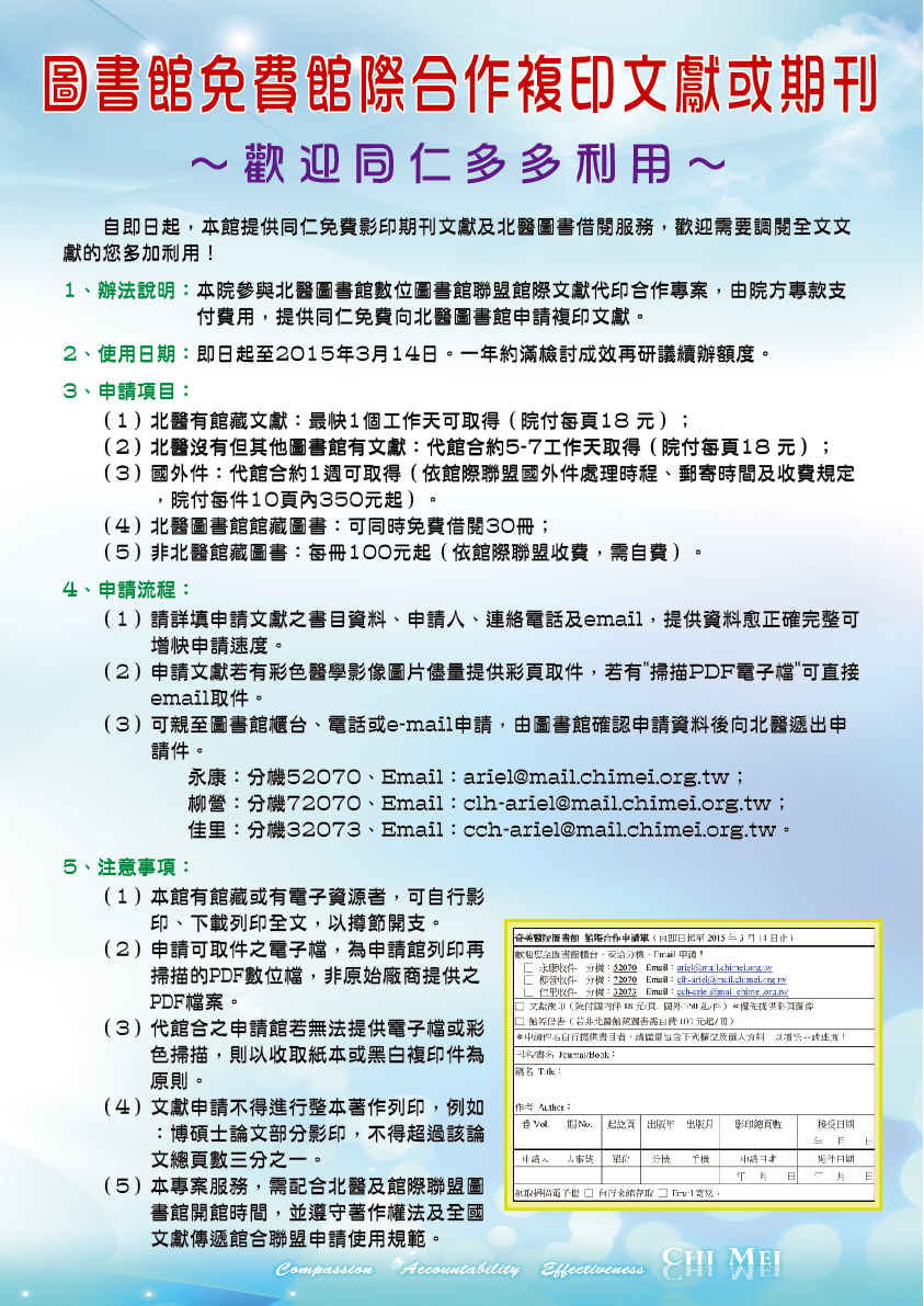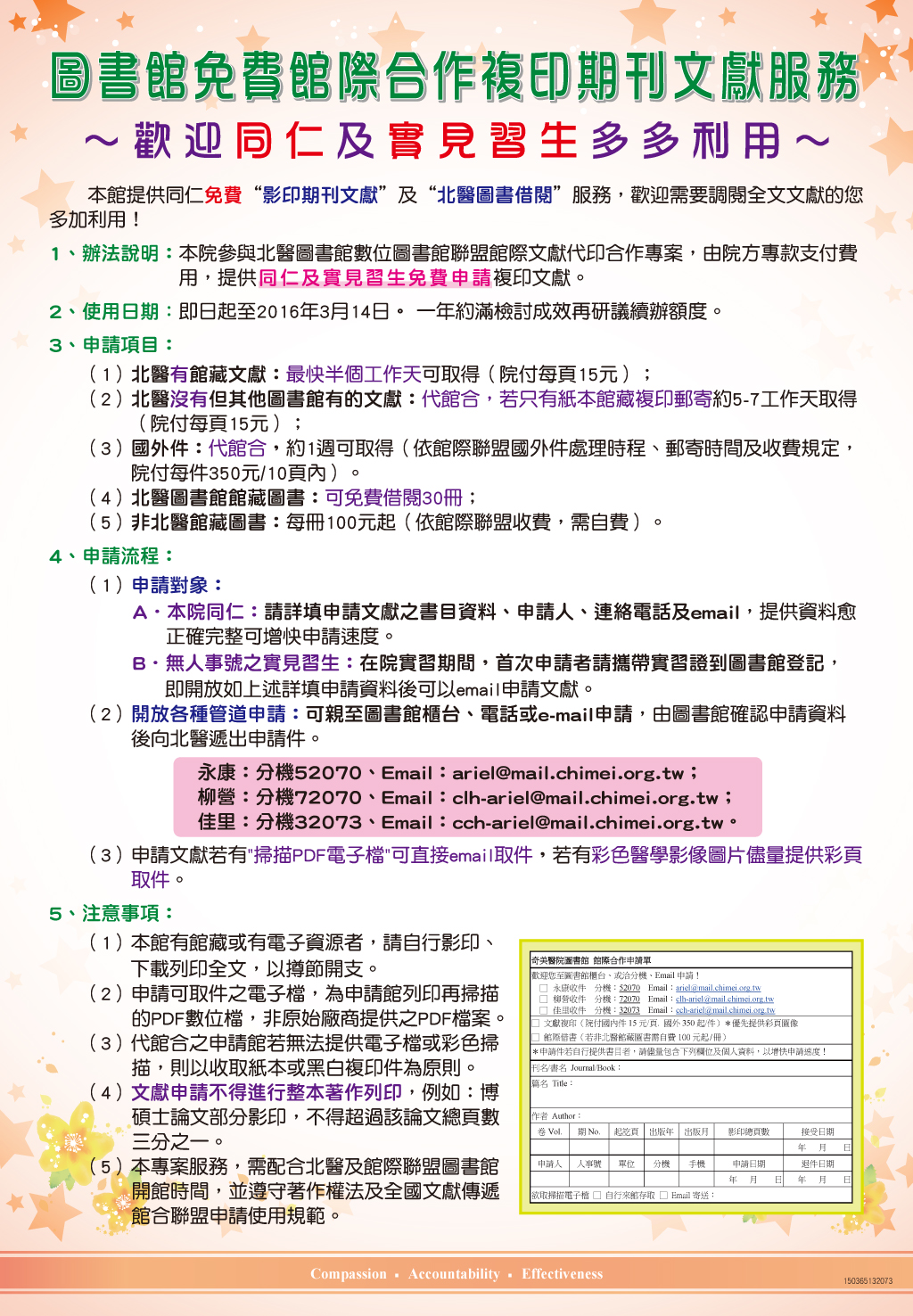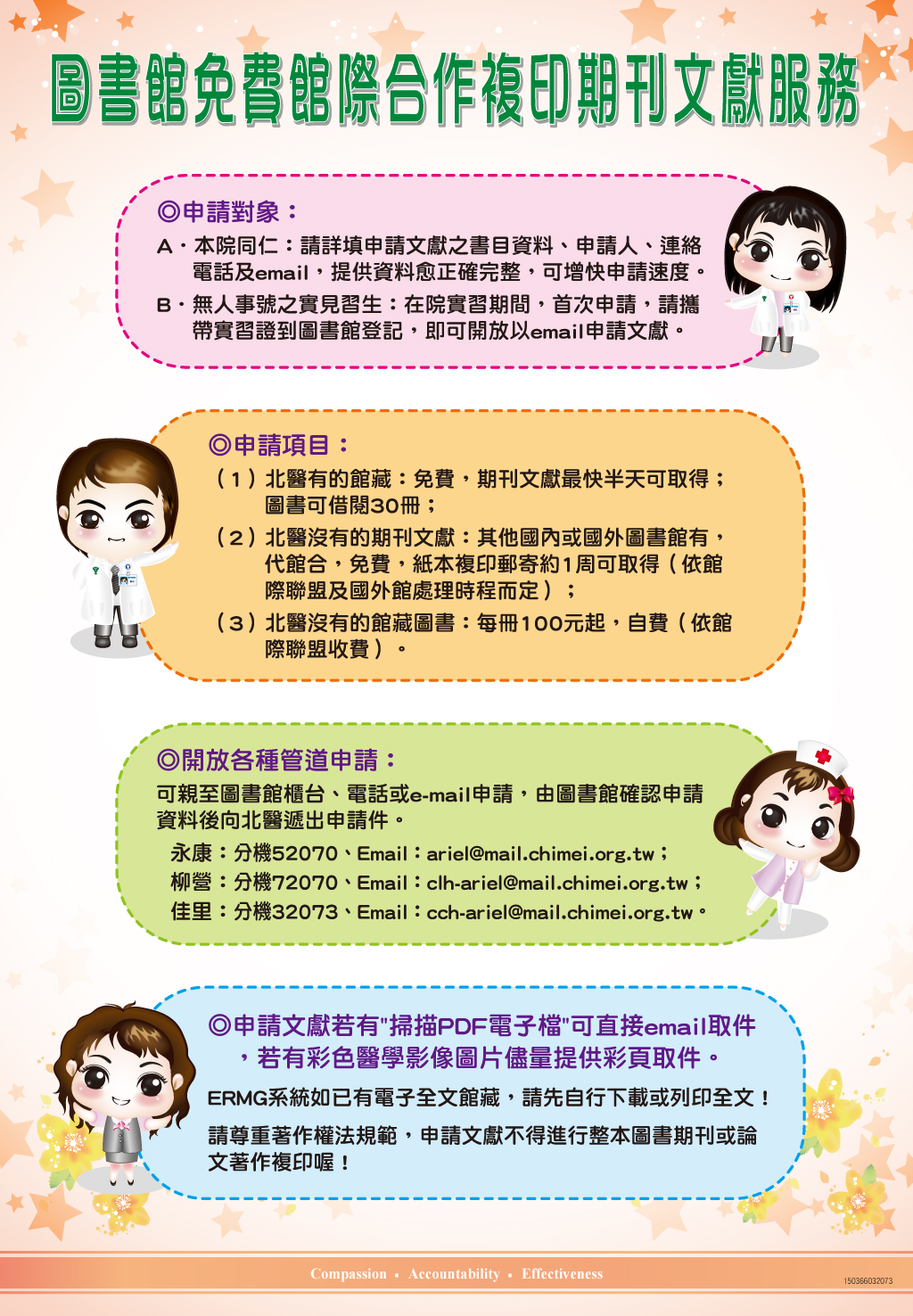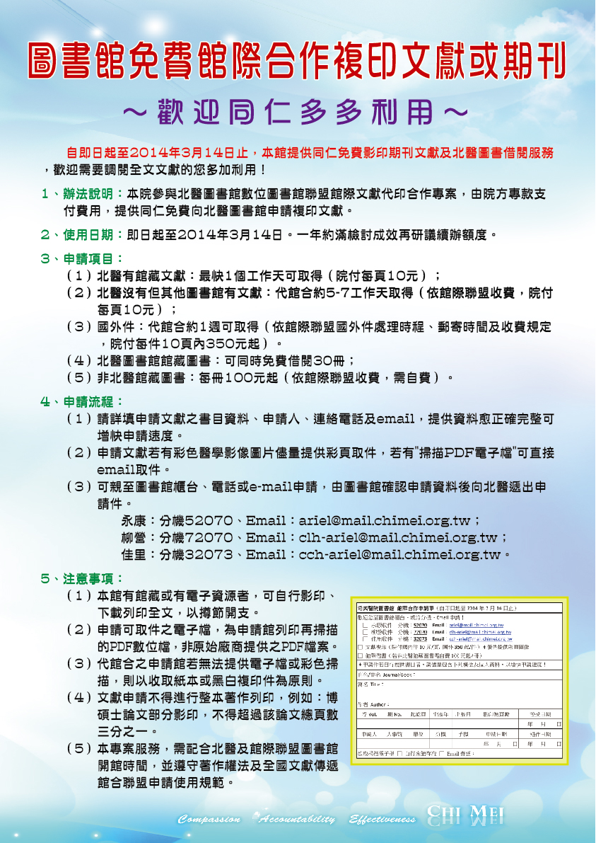 今年度院方再與北醫圖續約合作專案,由院方支付費用,提供同仁免費申請文獻複印資料,歡迎同仁多多利用!