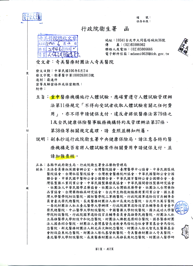 | «¥ÓÂåÀø¾÷ºc¬I¦æ¤HÅé¸ÕÅç¡AÀ³½T¹ê¿í¦u¤HÅé¸ÕÅçºÞ²z¿ìªk³W©w¡A¥ç¤£±o¥Ó½Ð°·«O¤ä¥I¡A±N¥[±j¬d®Ö¡A½Ð¬d·Ó¡C ªþ¥ó¡G½Ã¥Í¸p¤½¤å¡@ | |||