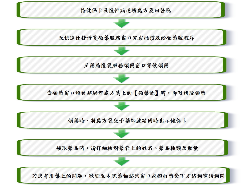 2. 2-3次慢性病連續藥品處方簽領藥在藥局1號領藥窗口。