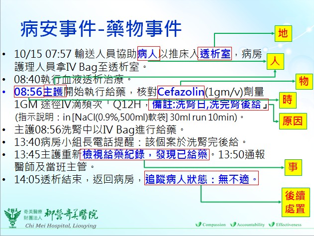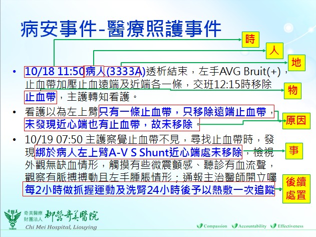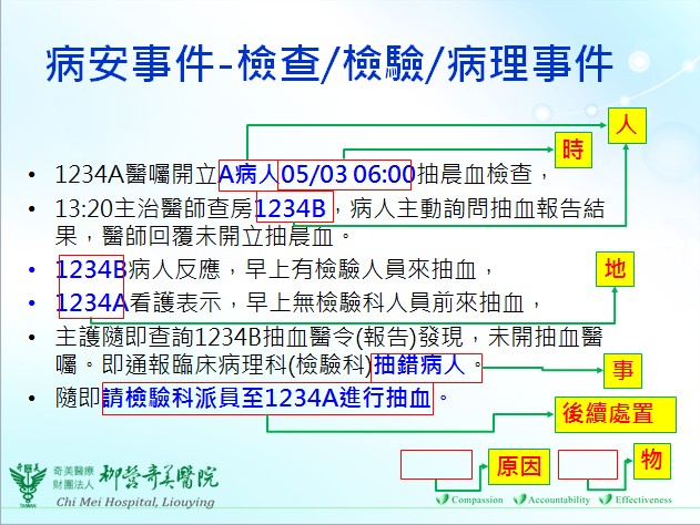 依通報事件嚴重度不同於時效內完整通報 (1)重度以上事件:24小時內完成通報至單位主管,72小時內通報至病安暨醫品委員會。 (2)跡近錯失、無傷害、輕度、中度事件: A.發生、發現單位相同:24小時內完成通報,病安管理人7天內送出案件,科部主管7天內送至病安暨醫品委員會。 B.發生、發現單位不同:24小時內完成通報,發現單位病安管理人3天內送出案件, 發生單位病安管理人7天內送出案件,科部主管7天內送至病安暨醫品委員會。 |
