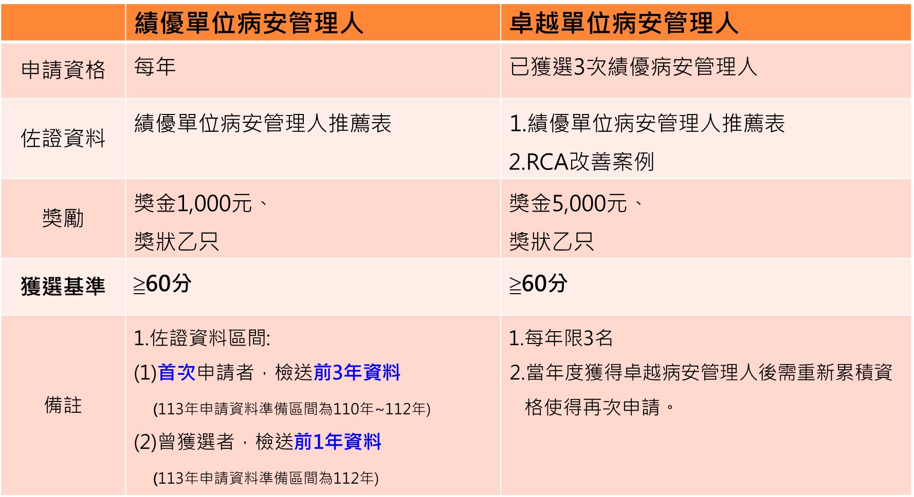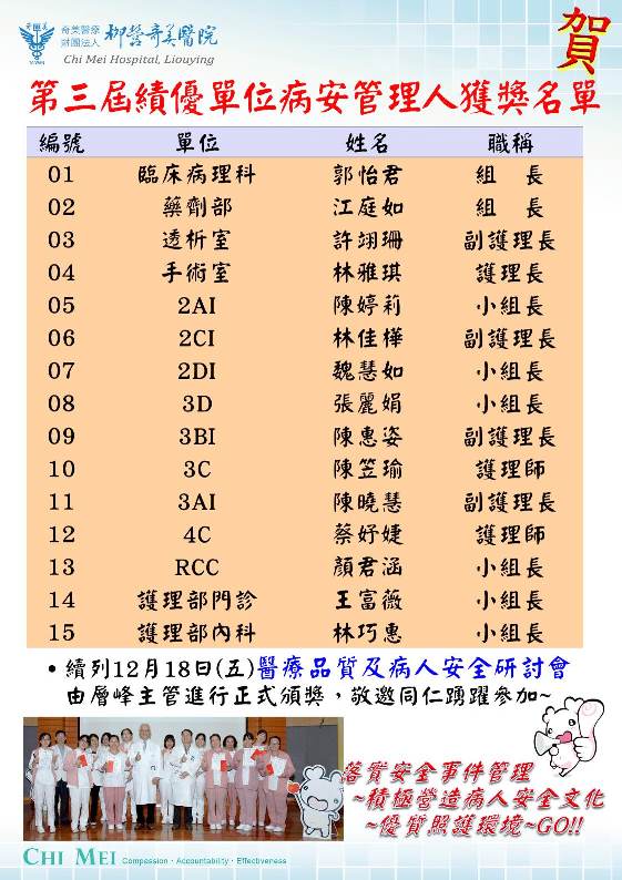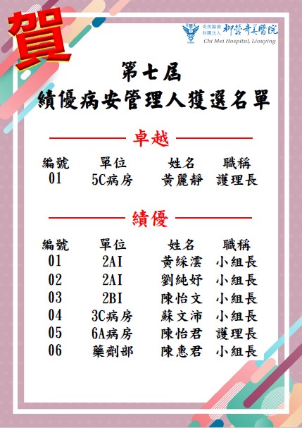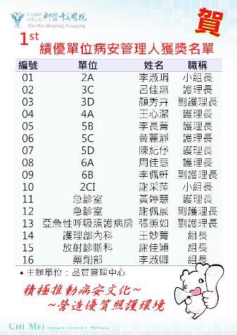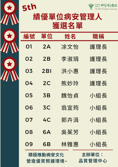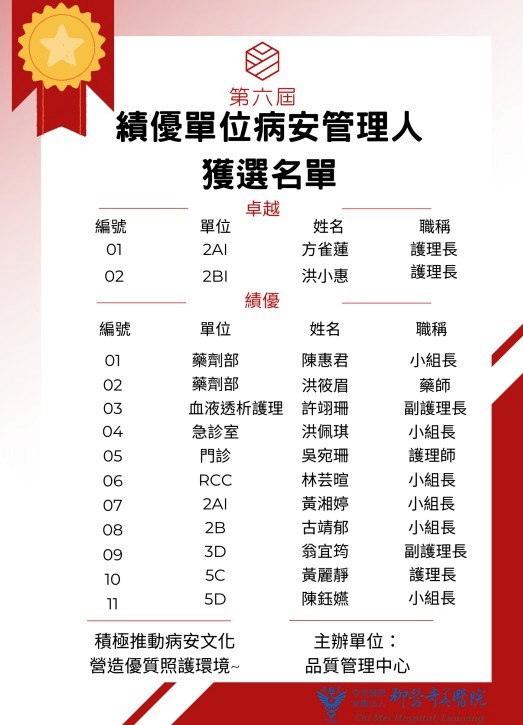 一、活動說明: 維護病人安全是醫療從業人員最重要作業的範疇之一,為鼓勵各單位及時通報病人安全事件, 積極介入預防及改善,各單位設置病人安全專責管理人員,推動至今,捷安報的通報已落實深根於各前線人員,功不可沒。 二、徵選資格:符合「病人安全事件管理程序書」,單位病安管理人職責者,完成績優單位病安管理人推薦表內容。 三、收件期 間:請將"績優單位病安管理人推薦表"中,"推薦單位主管簽章"欄位予主管簽核後,紙單送至品質管理中心, 其餘佐證資料以電子檔寄至品管中心信箱:clh9070@mail.chimei.org.tw,即日起至08月15日止。 四、獎 勵:入選者擬於2025年12月「醫療品質及病人安全研討會」進行頒獎,頒發獎狀乙紙與獎金。