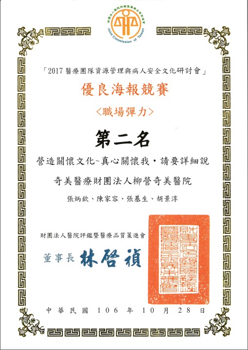| ►2017年10月28日參與醫策會2017團隊資源管理與病人安全文化研討會-榮獲復原力組海報徵選「第二名」殊榮 |