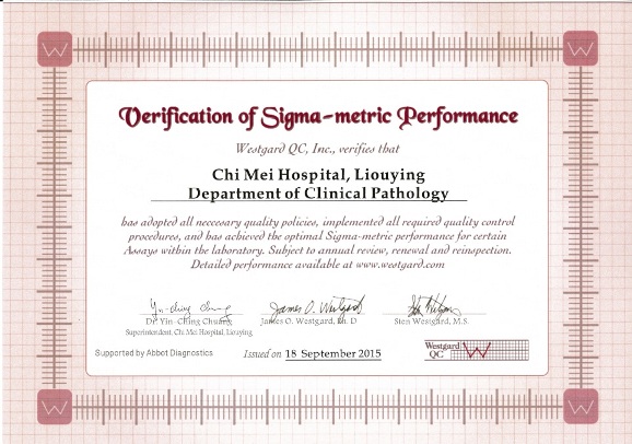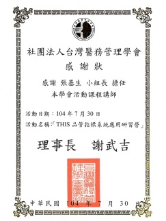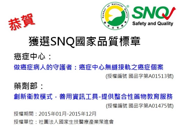 ►2015年12月21日-院際交流-台南市立醫院「指標通報資訊改善與實地訪查分享」課程講師-陳家容高級專員 ►2015年12月09日醫策會2015年度醫 療品質聯合頒獎典禮 ►2015年11月02日外院參訪-大林慈濟醫院參訪研習 「 PFM評鑑經驗活動」交流 ►2015年11月05日-醫策會P4P南區場標竿學習研討會「指標E化收集分享」」課程講師-陳家容高級專員 ►2015年10月14日-參與醫策會第16屆醫療品質獎HQIC第二階段發表記實 ►2015年10月6日-10月8日IHF World Hospital Congress(IHF)39th(2015) ►2015年9月22日-院際交流-嘉義基督教醫 院「從日 常醫療隨手做好醫療品質」課程講師-劉偉倫主任 ►2015年9月18日榮獲「美國Westgard 6 sigma 品管服務機構驗證」 ►2015年9月11日榮獲2015台灣健康照護聯合學術研討會「研究風氣優良獎」殊榮 ►2015年7月30日-院際交流-台灣醫管學會「THIS品質指標管理系統應用研習營-南區場」課程講師-張基生小 組長 ►2015年3月27日榮獲2015醫療醫療照護績優醫院競賽「銅獎」殊榮 ►2014年12月24日榮獲社團法人國家生技醫療產業策進會頒發「SNQ國家品質標章」殊榮 ►2014年11月27日醫策會台灣臨床成效指標暨病人安全文化調查運用成果發表會 ►International Society for Quality in Health Care