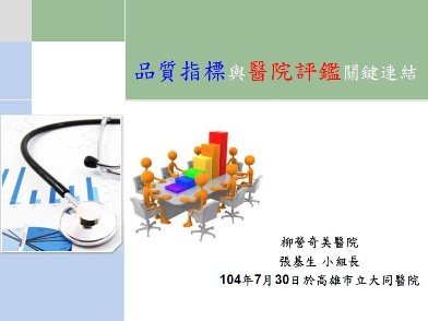(ISQua)31th(2014) ►2014年8月29-30日台灣健康照護聯合學術研討會暨亞太健康照護協會 年會 ►2014年8月6日-榮獲102年癌症醫療品質提升計畫「縣 市最佳合作夥伴獎」 ►2014年7月19日醫策會舉辦之醫療品質突破系列(BTS),榮獲「品質推動菁英獎」 ►2014年5月31日-院際交流-天主教諾瑟醫院「醫療團隊資源管理工作坊」課程講師-劉偉倫主任、陳家容高級專