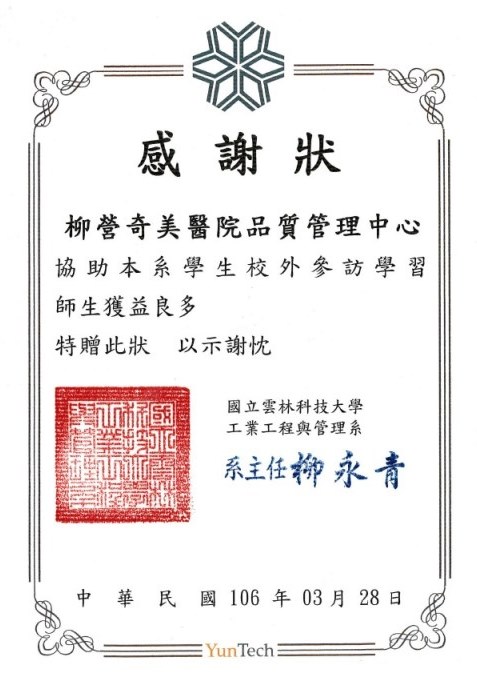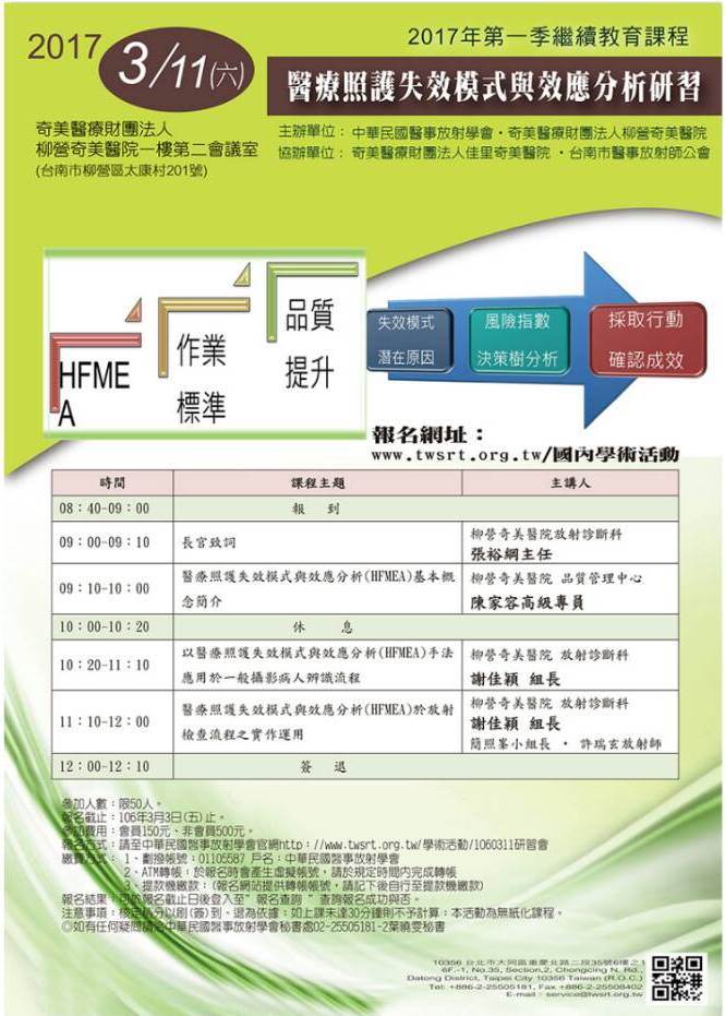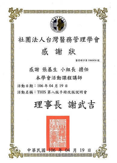 ►2017年12月26日-馬偕醫院台北院區「團隊資源管理成果TRM發表會」交流 ►2017年12月15日-院際交流-高雄市立小港醫院「THIS品管指標系統應用研習營」課程講師-張基生組長 ►2017年12月08日耳鼻喉科團隊、心血管中心團隊參與生策會國家品質獎徵選-榮獲「國家品質標章」殊榮 ►2017年12月08日參與生策會舉辦「2017年第一屆台灣醫療科技展」 ►2017年11月06日參與「2017台灣健康照護聯合學術研討會」-榮獲「論文優良團體獎」、護理團隊海報「榮獲海報人氣獎」殊榮 ►2017年12月01日長榮大學醫務管理學系來院參訪、研習 。 ►2017年10月28日參與醫策會2017團隊資源管理與病人安全文化研討會-榮獲復原力組海報徵選「第二名」殊榮 ►2017年10月24 日-院際交流-高雄市立鳳山醫院「品質指標管理-跌倒事件的預防」課程講師-張基生組長 ►2017年10月1日-10月4日International Society for Quality in Health Care(ISQua)34th(2017) ►2017年09月15、29日民眾代表楊思憶小姐參加「病人安全守護者工作坊」榮獲「病安之星」殊榮 ►2017年09月27日台灣醫療照護品質指標工作小組交流會議 ►2017年09月25-26日耳鼻喉科團隊及心血管中心團隊參加SNQ國家品質標章口頭審查 ►2017年06月03日參與交通大學舉辦「第十二屆國際健康資訊管理學術研討會」進行跨院際交流活動 ►2017年06月09日-院際交流-佳里奇美醫院「RCA根本原因分析」課程講師-張基生小組長 ►2017年06月06日-院際交流-佳里奇美醫院「品管圈(QCC)的步驟講解」課程講師-張基生小組長 ►2017年05月19日長榮大學醫務管理學系來院參訪、研習,16位師生學員參加。 ►2017年05月10日衛生福利部「醫院品質績效量測指標系統與落實品質改善第二階段計畫」奇美醫院團隊「最佳團隊獎」本院獲「指標績優獎」 ►2017年04月28日-院際交流-台灣醫務管理學會「THIS第八版改版說明會」一般照護指標系列-北部場課程講師-張基生小組長 ►2017年04月21日-院際交流-台灣醫務管理學會「THIS第八版改版說明會」一般照護指標系列-中部場課程講師-張基生小組長 ►2017年04月19日-院際交流-台灣醫務管理學會「THIS第八版改版說明會」一般照護指標系列-南部場課程講師-張基生小組長 ►2017年03月28日雲林科技大學工業工程與管理系博士班、碩士班學生來院參訪、研習,18位師生學員參加。 ►2017年03月25日榮獲「2017年台灣醫療照護品質績優醫院競賽」銅獎、張基生小組長獲頒「功在醫管 嘉惠永銘」殊榮 ►2017年03月11日-院際交流-中華民國醫事放射學會「醫療照護失效模式與效應分析(HFMEA)基本概念介紹」-課程講師:陳家容高級專員 |