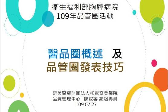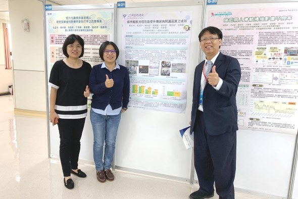 ►2020年12月30日-院際交流-衛生福利部胸腔病院 「品管圈活動輔導-2」-陳家容高級專員 ►2020年12月29日-院際交流-國泰綜合醫院「109年度醫病共享決策成果發表會暨專題講座」-張基生組長 ►2020年12月25日-「臺灣醫療品質協會-2020品質改善成果發表」-RCC跨科團隊、護理部ICU跨科團隊、藥劑部跨科團隊參賽紛獲佳績 ►2020年12月24日-「衛生福利部醫院品質及績效量測指標系統與落實改善計畫(P4P)年度推動成果分享」-佘紫瀅小組長 ►2020年12月02日醫策會病人安全週活動,榮獲「動員獎」殊榮,復健科、藥劑部分獲兩項「創意獎」殊榮 ►2020年11月26日醫策會P4P計畫「中小型醫院品質管理師訓練課程- 運用指標進行品質改善」專題講座-陳家容高級專員 ►2020年11月23日醫病共享決策實踐運動暨決策輔助工具競賽,榮獲「實踐績優獎、優秀團隊獎三組、輔助工具競賽一銅一佳作」殊榮 ►2020年11月23日-衛生福利部醫院品質績效量測指標及品質改善第三階段計畫頒獎典禮,榮獲「組合式照護品質績優獎-肺炎」殊榮 ►2020年11月20日-院際交流-衛生福利部胸腔病院「品管圈QCC-1」工作坊-陳家容高級專員 ►2020年11月20日-院際交流-衛生福利部豐原醫院「第二屆醫病共享決策(SDM)成果發表會暨專題講座」-張基生組長 ►2020年11月12日臨床病理科團隊參加SNQ國家品質標章口頭審查 ►2020年10月20日-院際交流-高雄市立民生醫院「PDCA寫作技巧」專題講座、工作坊輔導-張基生組長 ►2020年09月26日-台灣醫務管理學會-2020台灣健康照護品質管理競賽頒獎典禮 ►2020年09月18日-彰化基督教醫院-醫病共享決策(SDM)師資班及跌倒防治中心現場觀摩研習 ►2020年09月10-11日-台灣醫務管理學會「台灣健康照護品質管理競賽」-專案組(透析室團隊)、機構組(品質管理中心) ►2020年08月25日-院際交流-阮綜合醫院「從問題解析到文章撰寫要領」專題講座、工作坊輔導-張基生組長