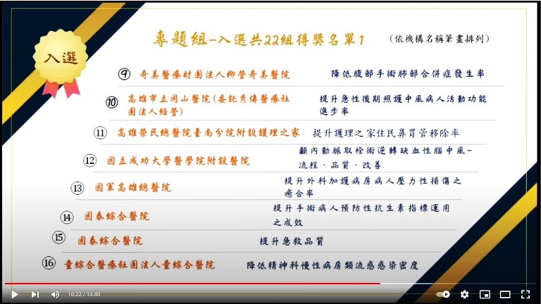 ►2021年12月04日「2021年台灣健康照護品質管理競賽頒獎典禮」機構組,榮獲「金獎」、專案組降低腹部手術肺部合併症發生率,榮獲「入選獎」。 ►2021年11月16日彰化基督教醫院「2021年醫病共享決策成果分享會」評審委員-總務室張基生主任 ►2021年11月10日新竹國泰綜合醫院「醫病共享決策推行與實踐研討會」-總務室張基生主任 ►2021年10月29日國泰綜合醫院「SDM的實踐與未來展望暨團隊輔導」-總務室張基生主任 ►2021年10月28日豐原醫院「SDM平台發展經驗暨團隊輔導」-總務室張基生主任 ►2021年10月12日萬芳醫院「醫病共享決策輔助工具設計團隊輔導」-總務室張基生主任 ►2021年10月04日彰化基督教醫院「合乎醫病需求的決策輔助工具設計要領暨初階主題工作坊」-總務室張基生主任 ►2021年09月24日台灣長期照護專業協會「SDM概念與PDA介紹應用」-總務室張基生主任、品管中心陳佩葶病安管理師 ►2021年09月03日-佳里奇美醫院「醫病共享決策推動經驗、安寧團隊輔導」-總務室張基生主任 ►2021年09月02日-義大醫療財團法人義大癌治療醫院「癌症醫病共享決策」-總務室張基生主任 ►2021年08月30日-彰化基督教醫院「醫病共享決策輔助工作具優化要領、優化團隊輔導-總務室張基生主任 ►2021年07月28日-院際交流-臺大醫院附設新竹臺大分院「醫病共享決策理論與臨床實踐分享」-總務室張基生主任 ►2021年04月23日-院際交流-阮綜合醫院「醫療團隊資源管理TRM營造正向關懷文化工作坊」-張基生組長 ►2021年04月16日-院際交流-豐原醫院「實證-醫病共享決策(SDM)實作工作坊」-張基生組長 ►2021年03月30日-院際交流-萬芳醫院「決策輔助工具優化經驗分享、SDM團隊優化工作坊」-張基生組長