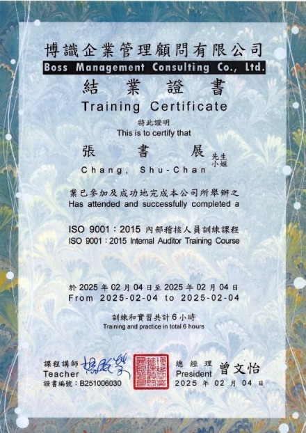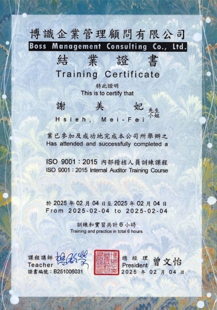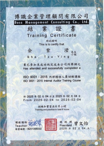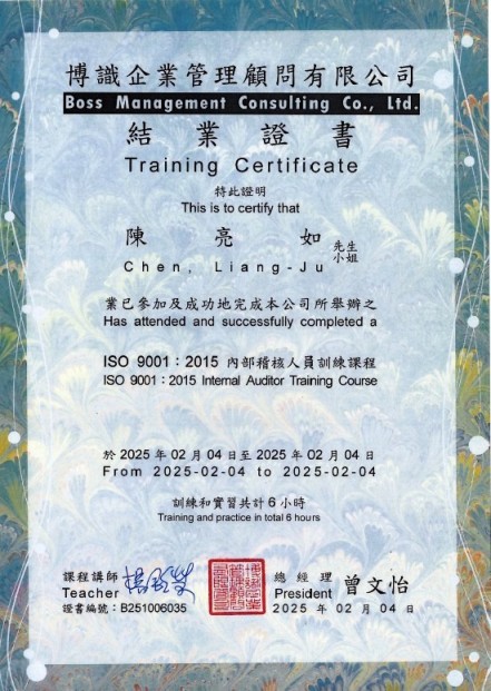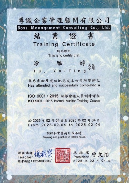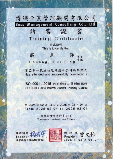 學 歷:國立中正大學醫療資訊管理研究所碩士 -其他-醫務會議(主)、醫療品質及病人安全工作目標(主)、病人安全週(主)、主治醫師聯誼會(主)、急救品質管理督導。 相關認證: -外部-護理師(考試院高考)、護士證書、助產士證書、教育部部定講師、腫瘤護理師證書、台灣安寧緩和護理師證書 -ISO 9001:2015內部稽核人員訓練課程結業證書(B251006030) |