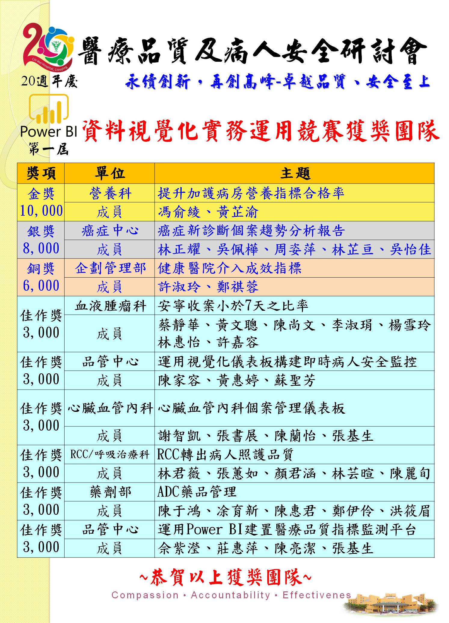 | 金獎團隊:獎狀乙只,獎勵金10,000元、銀獎團隊:獎狀乙只,獎勵金8,000元、銅獎團隊:獎狀乙只,獎勵金6,000元、佳作獎團隊:獎狀乙只,獎勵金3,000元 |