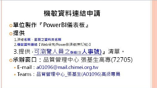 學習資源 「奇美醫療體系O365權限開通作法」 「PowerBI-web發佈方式說明」 「PowerBI機敏指標管理」 |