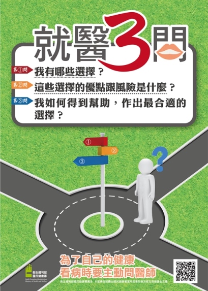 就醫時,可問醫師三個問題: (1)疾病治療,我有哪些選擇? (2)這些治療選擇的優點與風險是什麼? (3)我可以在哪裡得到幫助,才能做出最合適的選 擇? 醫院正在推廣這個門診醫師詢問的技巧,您知道? |