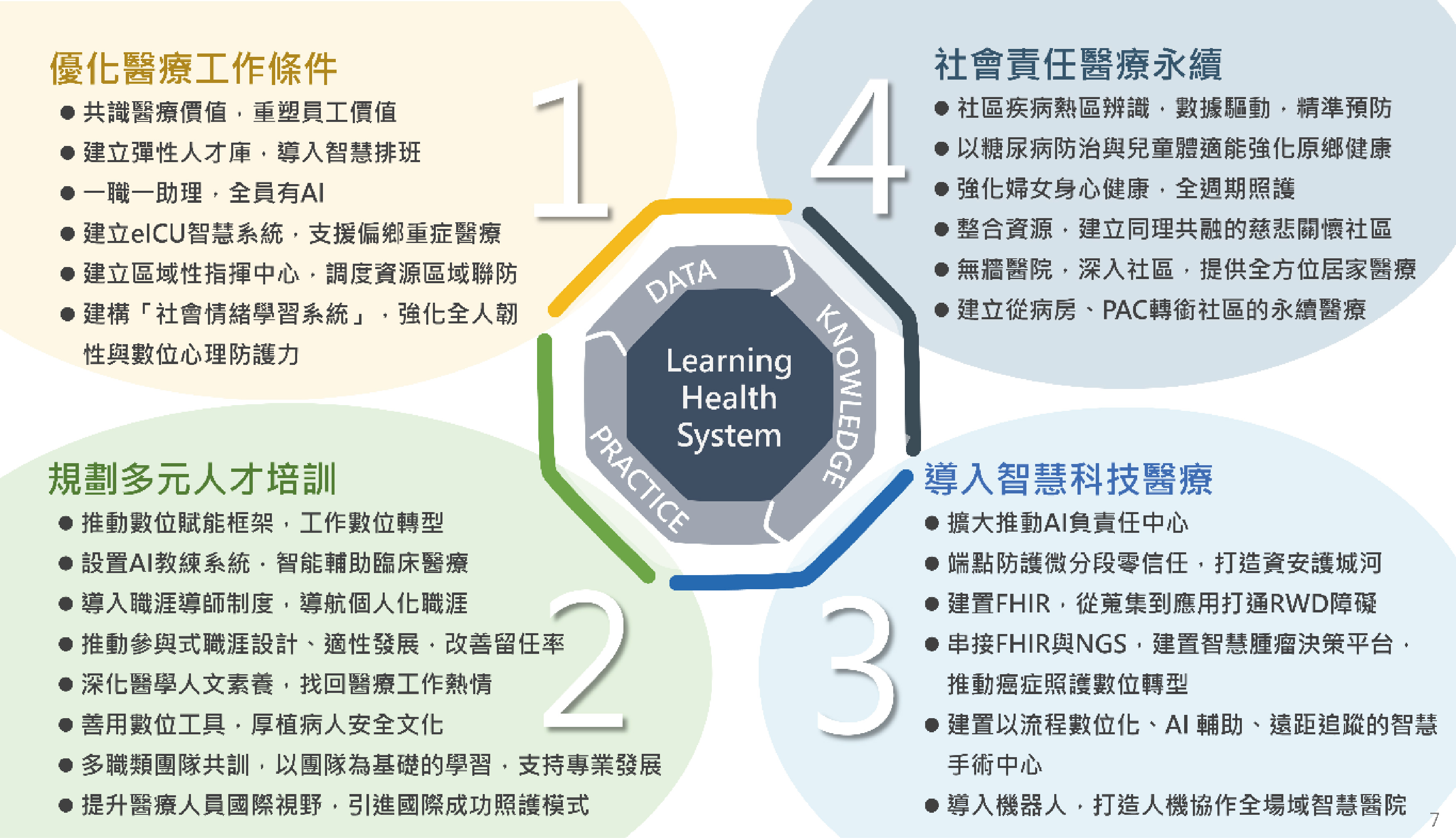 將建立跨專業、跨層級的區域人才培育機制,導入AI賦能的醫學教育體系與臨床能力評估架構,發展生活型態醫學、在宅急症照護、慢病整合管理、智慧科技應用及急重症區域共照等核心能力,透過智慧化職涯發展系統與創新培訓模式,達成「專業共訓」目標。
