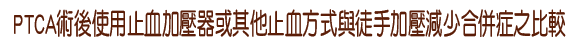 經文獻查證與評讀後發現,PTCA術後止血加壓方式與血管合併症的發生尚未有一致定論。故選擇止血方式或許與提供的設備與人力有關。