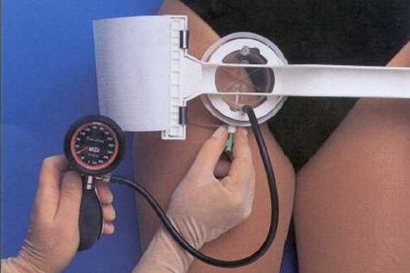 | 步驟三:評讀文獻(詳閱下表二) 1篇1a Critical Appraisal of Systematic Review:在APCD止血時間短於傳統加壓(平均差異,17分鐘; 範圍 14-19分鐘)。APCDs易產生血腫(RR為 1.89; 95%CI為 1.13-3.15)和假性動脈瘤(RR為 5.40; 95%CI為 1.21-24.5)。只有少數證據表示APCDs是有效的,且可能會增加血腫和假性動脈瘤的風險。 3篇 1b RCT: 結果顯示使用人工加壓比機器或Femostop(圖三.)有較少合併症(血腫)產生(P0.04)。 三種加壓方式對血管合併症(血腫、瘀青、滲血)、疼痛不適無顯著差異。但使用C-clamp<30 分,即可止血。Femostop ®止血時,時間是>30分。研究結果顯示使用人工加壓止血時間為15分鐘,使用Quicklamp止血時間29分鐘;使用 機械性加壓的血腫發生率較手壓低,顯示使用Quicklamp加壓設備較人工安全。 |