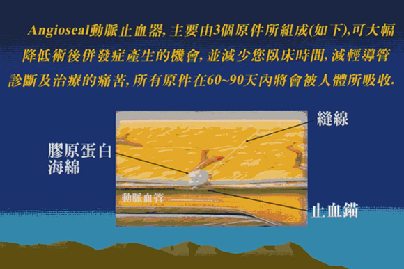 置指引管常用的部位。使用機械式加壓止血器(圖一.)或動脈閉合器(angio seal) (圖二.)是否能減少出血及血腫仍有爭議。針對加壓方式的選擇及移除sheath的高合併症,引發實證小組探討。