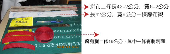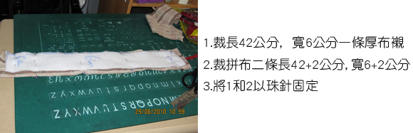1.長42公分﹐寬6公分一條厚布襯(棉襯約10元)。