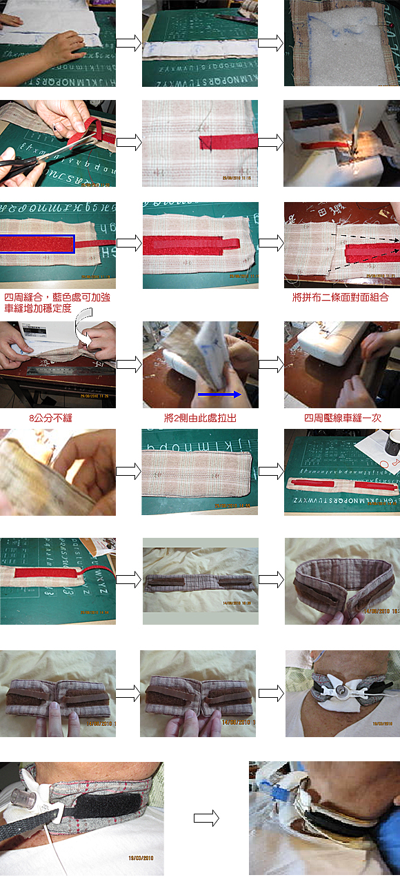 由於在急診工作已數十年,不乏看見有放置氣切病患來求診,但10人當中,至少有7-8人的氣切帶幾乎是呈現骯髒並卡有黴垢,甚至有些是帶子與皮膚的交接處,已有1度壓瘡的產生,感到心疼且感嘆照護品質怎麼會是如此,詢問照護者,回答不外乎是帶子成本昂貴及更換帶子費時且麻煩,於是激發作者製作「便利型氣切固定帶」的動機,不僅外觀好看且成本便宜,一條約40-50元也可以重覆使用,且製作過程及更換步驟簡單、便利,實是值得使用及推廣。