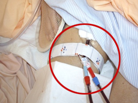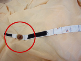 | 作品創意 | 管路滑脫會造成病人血液流失、感染、空氣栓塞、休克,更嚴重的傷害。臨床上皆以紙膠黏貼管路,對皮膚過敏、乾燥、水腫,意識不清或躁動的病人,易造成紙膠捲曲及脫落,致滑脫事件頻傳。團隊為加強管路固定創作「管路固定輔助帶」,預防管路的滑脫,維護透析安全。 | ||