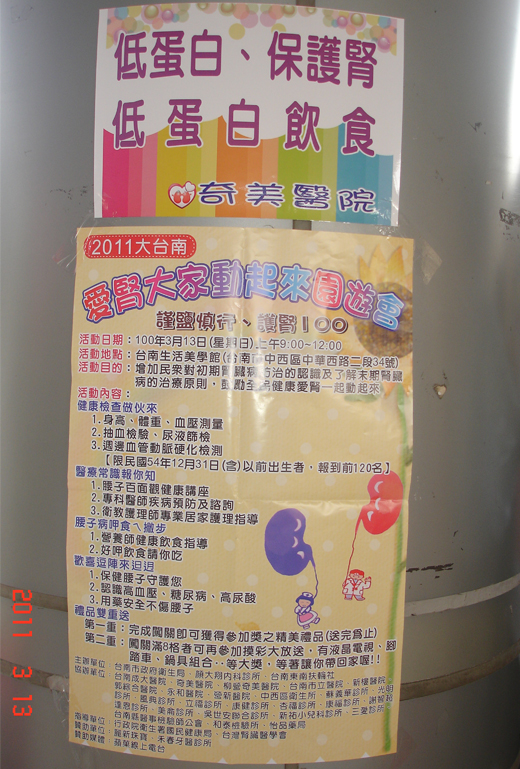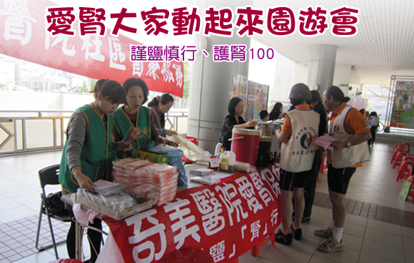 一年一度的國際腎臟日-3月10號,配合國際腎臟日的活動,由台南市政府衛生局主辦、本院腎臟科參與協辦,於3月13日在台南生活美學館辦理「愛腎大家動起來園遊會」。腎臟病是國人健康的一大隱憂,調查發現只有一成的患者知道自己有腎臟疾病,有鑑於此台灣腎臟醫學會除了積極推動「腎臟病健康促進機構」也加強宣導「護腎333」每3個月定期接受驗尿、驗血、量血壓的3項護腎檢查,的觀念,讓你贏得「腎利人生」!