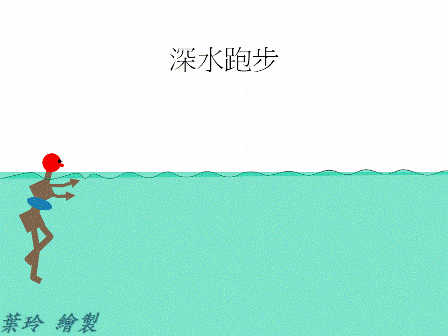 深水跑步-著重在利用水阻力正確使下肢肌、訓練心肺耐力。水可以提供良好的阻力訓練,而且它沒有陸跑帶給關節的壓力。在前進時,抬頭挺胸、收小腹,但身體直立略微前傾、手掌做杯狀前後擺動,以保持平衡,手腳動作要像在陸地跑步般協調。