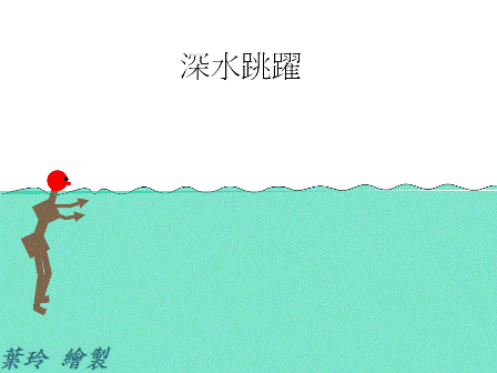 深水跳躍-維持下肢肌力。動作類似深水划雪,但不使用浮具,雙腳著地,在水中原地跳躍,給予膝關節輕微的衝擊刺激,對側手腳輪流做前後擺動。