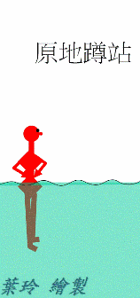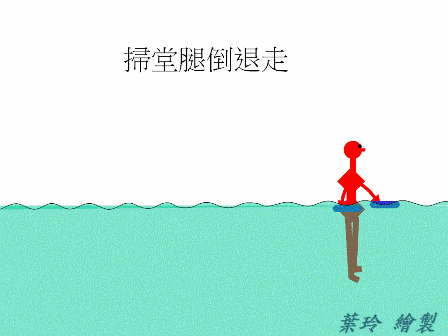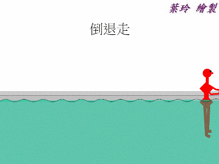 掃堂腿倒退走-掃堂腿加上倒退走。單手扶牆或雙手側持浮具(貼水面)平衡保持,做每一下掃堂腿的向後劃半圓,就順勢後退一步站,換腿向後劃半圓。