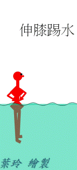 伸膝踢水-以能踢出水花為目標。患側手先扶牆,健側單腳站。患側腳慢慢踢水,再收回立正姿勢,反覆做4至5分鐘。再換健側手扶牆,患側單腳站,健側腳慢慢踢水,再收回立正姿勢,反覆做4至5分鐘。兩側輪流,在身體平衡之下漸漸加大踢力。