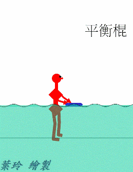 平衡棍-延展大腿後側肌肉及平衡訓練為目的。雙手扶牆伸直,健側單腳站,身體前傾接近水面、患側腳同時向後抬起(接近水面下),全身呈T字形,並感覺健側大腿後肌延展10秒。兩腳換邊做。