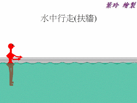 水中散步-練習中身體平衡、熟悉水浮力。健側手先扶牆慢慢向前行走,沿水池邊走至末端再回頭,換患側手先扶牆慢慢行走,來回輪流4至5分鐘。在舉腿行走時,速度應該保持在有阻力的感覺,利用水的阻力鍛練臀部和腿部。若感覺身體平衡良好,漸漸加快步伐,進而漸漸放手不扶牆,改為雙手側持浮具(貼水面)或徒手撥水維持平衡。