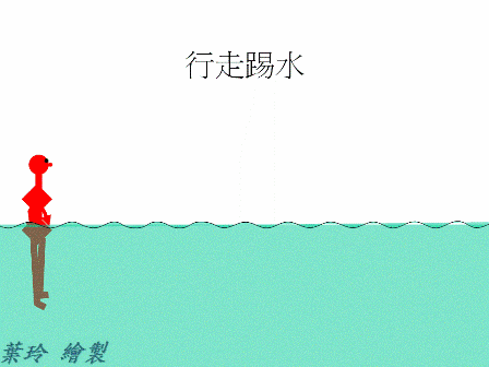 直線移位(淺水區)-此類活動需要前進或後退,以身體平衡為目標。當患側為支撐腳時,動作宜放慢、可適度蹲低。叮嚀:水中步行時,宜穿著水中專用鞋,每一步皆需踏到底。若只用腳尖,會造成上岸後小腿肌肉僵硬。