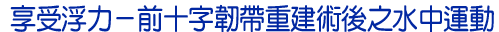 在溫水游泳池裡,我們可以設計出許多在陸上做不到的水中運動,在關節的最小衝擊,且最大的肌肉訓練阻力之下,幫助下肢骨科手術後的病人做主動運動。以下以單側膝前十字韌帶重建手術後為例。