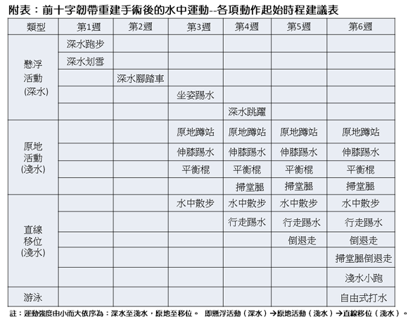 水中運動的動作搭配浮具與水深,能夠有許多種變化(台灣水適能協會,2006;Brotzman & Wilk, 2003),運動強度依序由小而大,原則為深水至淺水,原地至移位。以下介紹幾個適合在術後6週內練習的水中運動,而各項動作依序為:懸浮活動(深水)、原地活動(淺水)、直線移位(淺水),如下方附表。