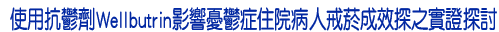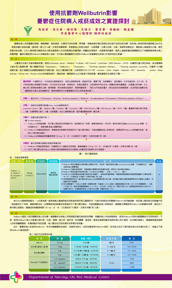 憂鬱症病人常因情緒低落、自責及不安的反應、負向思考、情緒崩潰引發自殘行為而住院治療。面臨病人有菸癮問題,出現煩躁、注意力分散、失眠、焦慮等戒斷症狀,更導致病人情緒欠穩,甚至拒絕住院治療。因抽菸對身體有害,臨床上會請家屬自費購買尼古丁相關製劑來解決病人菸癮問題,醫師亦會使用wellbutrin來幫助病人戒菸。本文以實證醫學方式探討wellbutrin對憂鬱症住院病人於戒菸成效之影響。