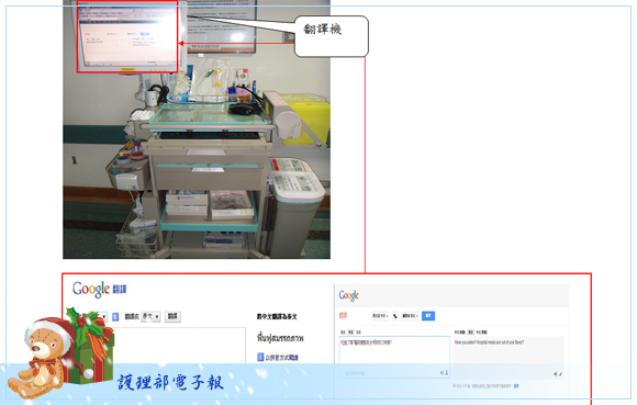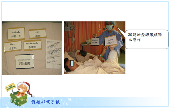 5.溝通字卡(communication card ):用心的職能治療師鳳瑛也共襄盛舉,利用Google翻譯軟體將日常生活用字做成溝通字卡,和外籍病患建立有效之溝通模式。