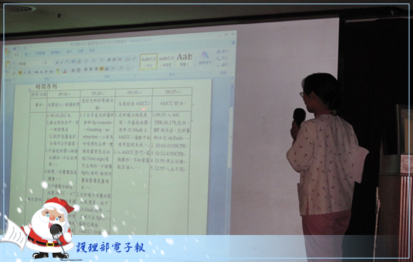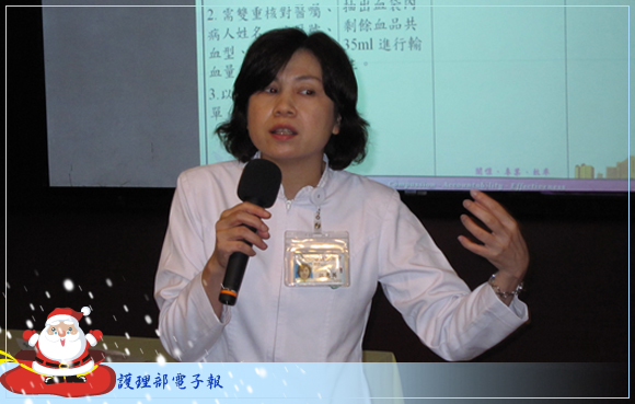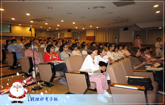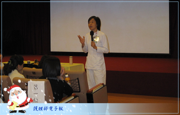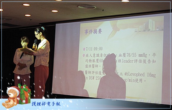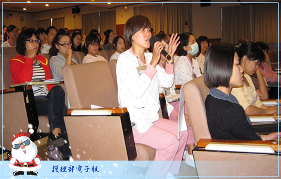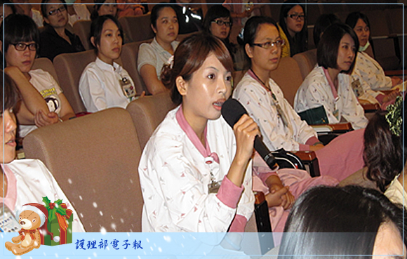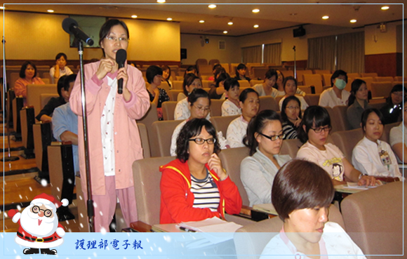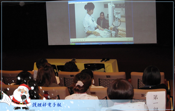 成效發表會當天,先由護品委員會主席說明規則,接著歡迎當天評審佳里院區馬淑清主任及永康院區江惠英副主任;報告中只見各組又是拍片、又是演戲,路過的人還以為走錯會場!整個活動過程充滿笑聲,仔細觀看就會發現,各組報告者把1個月來的成果呈現給與會者,台下的參與者也積極提問或提供想法;當然串場主持人馬主任、江副主任也極力發揮扮演兩造之間的橋樑,大夥無不卯足全勁,期望爲自己或自己的組別爭取好成績及禮品。