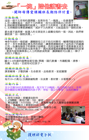 在2012年的開始,我們透過奇美醫療服務社拋磚引玉,立下新年新希望:希望能募集到至少500個關心弱勢孩童教育的夥伴,每天存下一塊塊的零錢,每個月至少捐助300元,幫助闕師母的課輔班繼續經營下去。