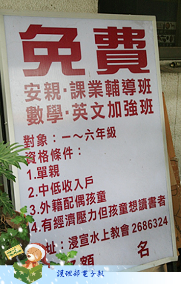 開辨在教會裏的課輔班是不收費的,教會提供的教室和設備雖不完善,但對孩子們來說還算舒適。課輔班主要輔導的是國小1~6年級的學生,目前有42位孩子,全是清寒、單親、隔代教養和外配子女,由於經費與人力的限制,目前還沒有能力接受隔代教養的孩子。