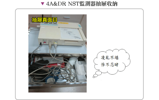 婦產科護理人員為了照顧孕婦及胎兒的健康,每天都會接觸到”胎兒監視器”,為了是要了解孕婦宮縮壓力及胎兒心跳變異性,以確保母子(女)的安全,所以便利的工作環境是必要的,但在臨床上,由於護理人員工作的忙碌,又加上監視器抽屜未做收納規畫,導致一打開抽屜,眼見的是這慘不忍睹的景象。