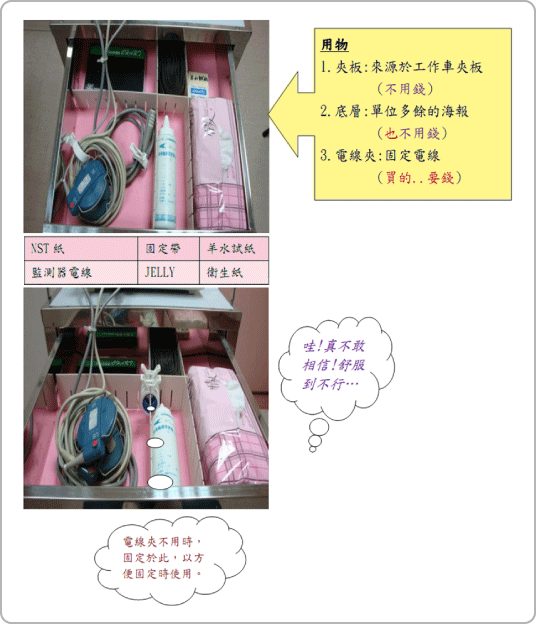 面臨這景象,不禁讓我很好奇,姊妹們在使用時,內心有甚麼想法?一問下來,大家都覺得凌亂的抽屜讓人工作起來大不易,也不方便收納,心情往往也因此而深受影響。此時藉由護理部舉辦的「工作環境創意競賽」活動,心想著不僅可以改善單位工作環境,還可以申請經費,何樂而不為呢!於是同事們開始動腦,也請熱心的佐理員主動提供單位可用的材料,如隔板及壁報紙,也跟同事去大賣場尋找可用之材,雖然有買了卻不適用的工具,但最後終於在文具店裡把工具給找齊了。接著開始規劃物品該如何擺放?經過反覆調整位置,最後成果終於出來了!與之前的慘況相比,簡直是天壤之別,在視覺上不僅整齊舒服,在使用上物品也依照大家索取的方式擺放,同事們使用後也覺得不僅方便索取,也較易收納;在花費上,當阿長看到成果時,問我花了多少錢?我告訴阿長,除了利用單位現成的材料外,共花了38元,阿長便直說:「用少成本,也達到不錯的效果!」,心想真是一舉兩得啊!