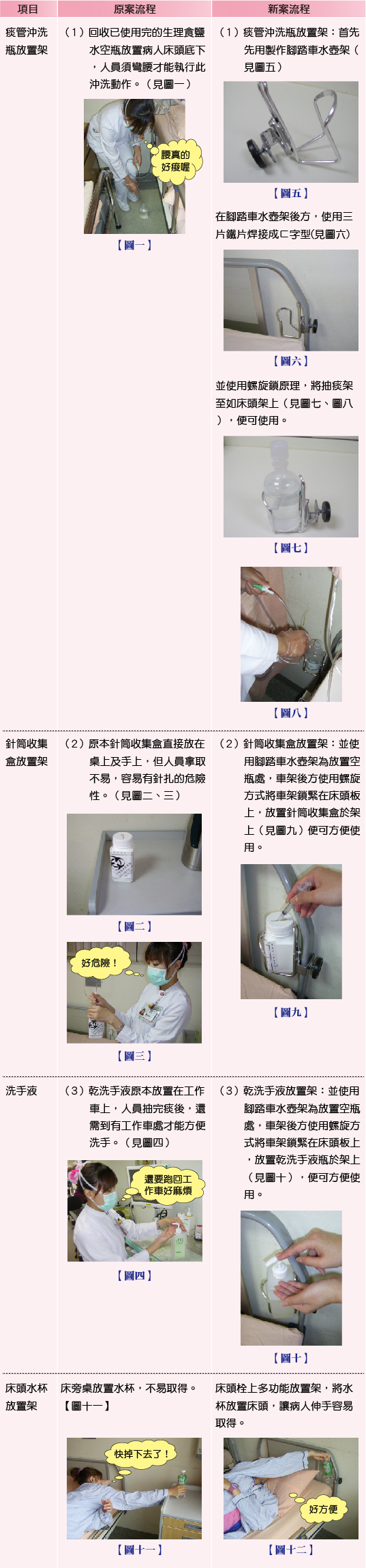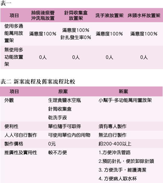 護理人員臨床工作長期繁忙緊張,若能增加臨床工作上小細節方便,動動腦,便能維護下背姿勢疼痛改善、預防針扎安全、增強洗手概念,管制感染風險,改善硬體限制之外的、工作不易不便的困難,小創新大發明,著實對臨床工作有大大幫助。期待健康安全的工作環境可以提升護理人員健康的心靈和工作品質,讓醫病雙方都能達到臨床照護的全人滿意度。 - 附實物模型及照片