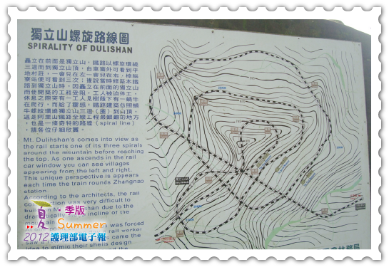 【獨立山螺旋狀路線】故事是這樣來的,傳說當時修築鐵路時,因聳立在前面的獨立山,使工程停擺,導致工人被迫停工,在休息之餘,工人忽然見到樹蔭下有一隻蝸牛在爬行,而有了仿造蝸牛螺紋環繞獨立山三圈到山頂的想法,這也是阿里山鐵路全線工程中,最艱難的地方,也是一條很特別的路線。