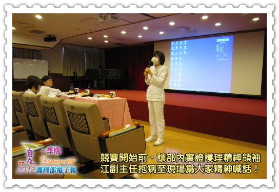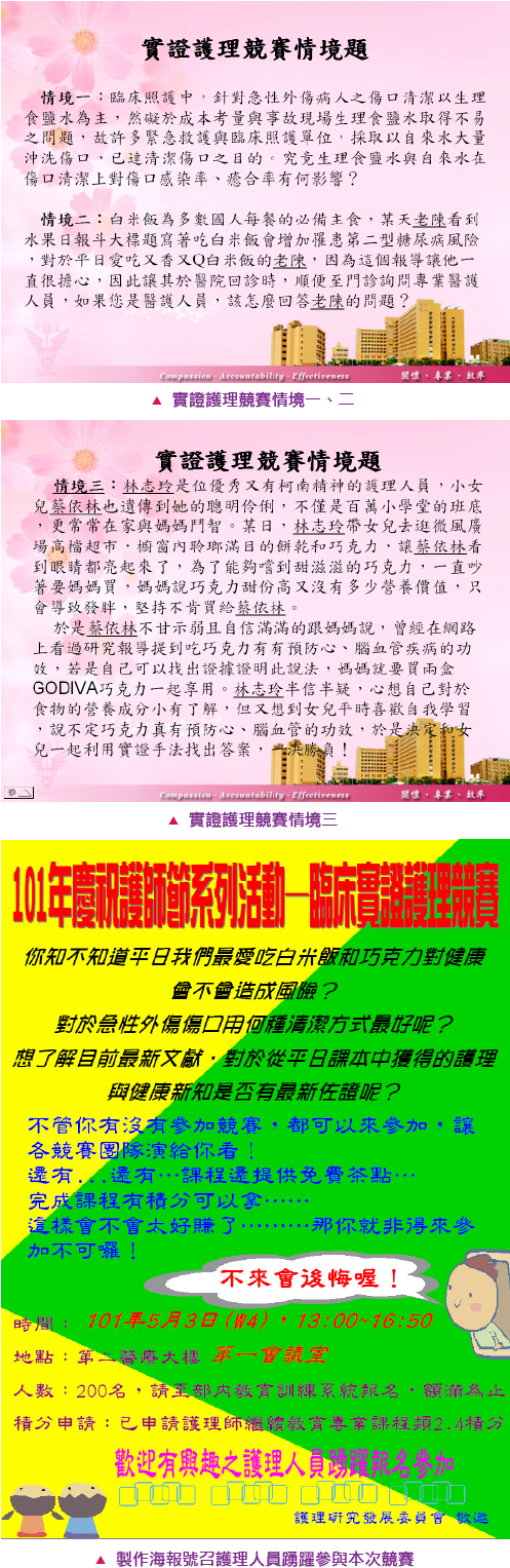從99年度舉辦第一屆實證護理競賽後,各單位熱烈迴響,原本預定在100年舉辦的實證護理競賽活動,因巧遇醫院評鑑故延至101年舉辦,在研發委員會委員熱烈討論,本次活動目的訂為「提升臨床護理人員對實證護理方法熟悉度」為主,為了不讓參與成員壓力太大,決議每隊至少五名成員參加,也同時考量要與跨領域團隊概念結合,因此強調本次報名團隊需含跨團隊人員至少一名參加,因此也上簽呈申請活動經費與獎金,也獲得院方的支持。於3月中旬公告競賽辦法,並開放報名,於是報名結束後,竟然只有三組團隊報名,這讓委員們不禁是否要思考,到底發生什麼事情,竟然乏人問津?於是穎俐專員在護理長會議與各位督導大力宣導下,最後共有十組團隊參加,十組團隊中每隊含有醫師與藥師共同參與本次競賽。