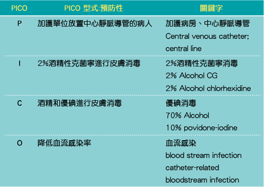 本臨床問題題為「2% Chlorhexidine酒精溶液,於執行血流相關導管照護,確實有較於傳統執行管路照護,有效降低血流感染率嗎?」,將PICO形成如下: