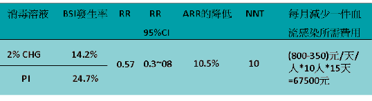 經文獻研究整理,針對0.5%alcoholic chlorhexidine(alcoholic CG)、2% chlorhexidine及10% povidone iodine 進行比較,證明水溶性CHG和酒精CG者之間對於中心靜脈導管消毒無顯著差異。但是也證實使用chlorhexidine比PI 消毒有效降低血流感染發生率,及有效防止革蘭氏陽性菌感染,可有效運用於臨床中心靜脈導管穿刺病人,有效降低血流感染發生率。