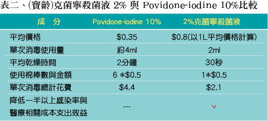- 醫療成本面:針對臨床護理人員執行面,使用不同規格棉枝沾chlorhexidine消毒溶液,成本耗費也不同,此外反覆利用棉枝沾取消毒液,破壞無菌原則,建議提供單一拋棄式消毒規格,節省備物時間及提升無菌原則。