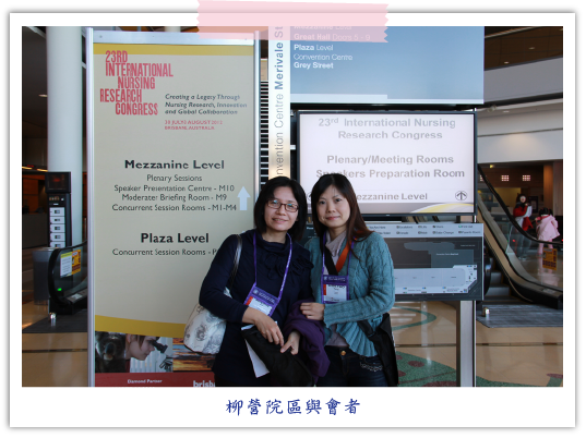 本次會議共有5天(7/30~8/3),護理部共11人(永康總院9人、柳營院區2人)參與本次盛會,共有1篇口頭報告及11篇海報參與發表,一行人風塵僕僕抵達澳洲參與學術會議,配合大會主題「Creating a Legacy Through Nursing Research, Innovation and Global Collaboration」進行學術發表。而值得一提的是此次會議地點位於布里斯本會議中心(Brisbane Convention & Exhibition Center),其對面也有風景宜人的南岸公園(South Bank Parklands),參加會議中間還可以步行5分鐘至公園休息,離市中心步行約20分鐘。