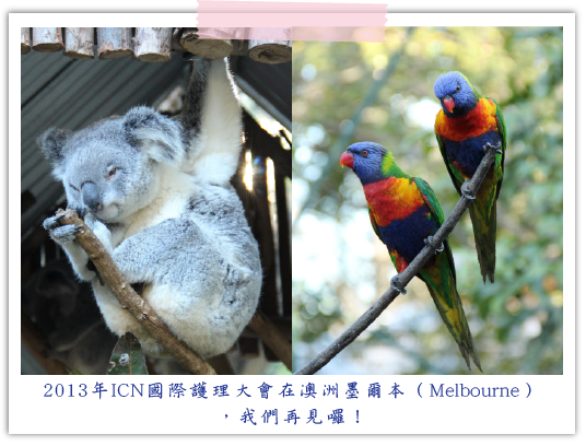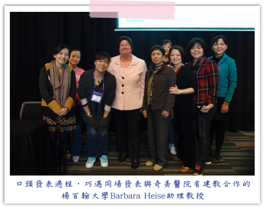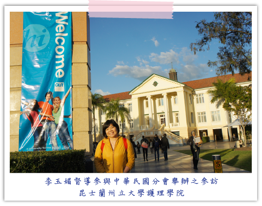參與本次會議過程,除了參加學術會議發表外,可選擇與中華民國分會至昆士蘭州立大學(Queensland University of Technology,QUT)護理學院參訪,也可以選擇參與會議中有興趣的主題聽講,我找了John W. Nelson等研究者所主導的國際關懷照護研究計畫(Caring International Research Collaborative (CIRC):Clarity of Self)聽講,這個計劃跨六個國家,和與會者分享其合作研究的結果,運用5C(commitment, collaboration, confidence, competence and clarity),可以讓護理人員更適應其工作與服務病人;他們也運用幾個護理理論於研究中,在聽講的過程,才會發現真的需要讓自己的思路不斷有新的衝擊,一個研究團隊可以做到跨國研究,真是令人刮目相看。
