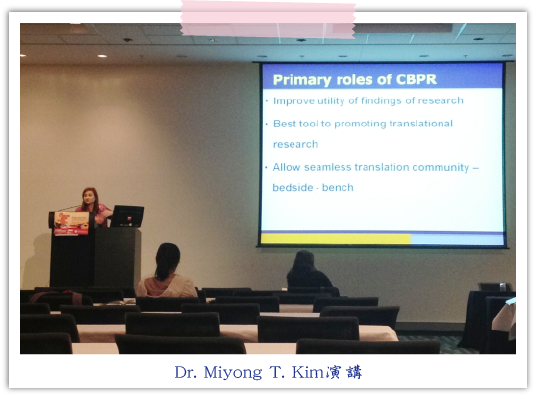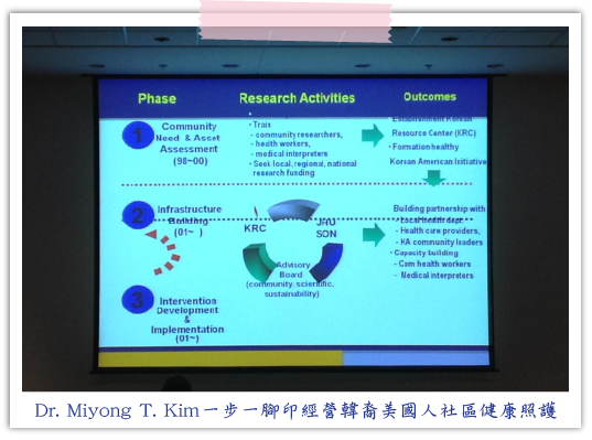 其中我選擇未來有興趣的主題「Building Healthy Community Through Participatory Research」,是由Dr. Miyong T. Kim所主講,其任職於約翰霍普金斯大學(Johns Hopkins University)的護理學院教授,也任職該院的弱勢族群心血管健康中心(Center for Cardiovascular Health in Vulnerable Populations)的主任,因Dr. Miyong T. Kim是韓國人,大學畢業至美國從事護理工作,所以她對於到美國發展的韓裔美國人的社區健康照護經營特別關注,其在演講中提到,她對研究族群是非常用心關懷,在研究過程分幾個階段進行:了解社區問題、與社區居民建立夥伴關係、在社區執行照護計畫、成立相關委員會承擔社區健康照護責任等,她從這樣過程,從研究介入及改善社區居民的心理健康照護、照護者關懷、肥胖以及肝炎等健康問題。